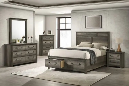 mrliquidatorgray queen 5 pc queen bed ,dresser, mirror, chest ,nightstand FULL: 58″ x 80″ x 57″H QUEEN: 65″ x 86″ x 57″H KING: 80″ x 86″ x 57″H DRESSER:60″ x 1...