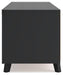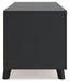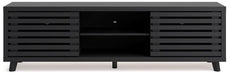 Entertain the art of modern living with this TV stand. Pairing a subtle wood grain look with a trend-right matte black finish, it’s beautifully in tune with your clean-lined design sensibility. Packed with potential, two sliding doors reveal even more adjustable shelving, just the ticket for storing your tech consoles, DVDs and games.
