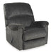 A mastery in "less is more," this rocker recliner manages to make cool, contemporary design so warm and cozy. Its smoky gray upholstery, incredibly plush to the touch, is a new twist on neutral. A curved divided back and a deeply tufted footrest give the clean-lined profile a sense of sumptuousness that's impossible to resist.