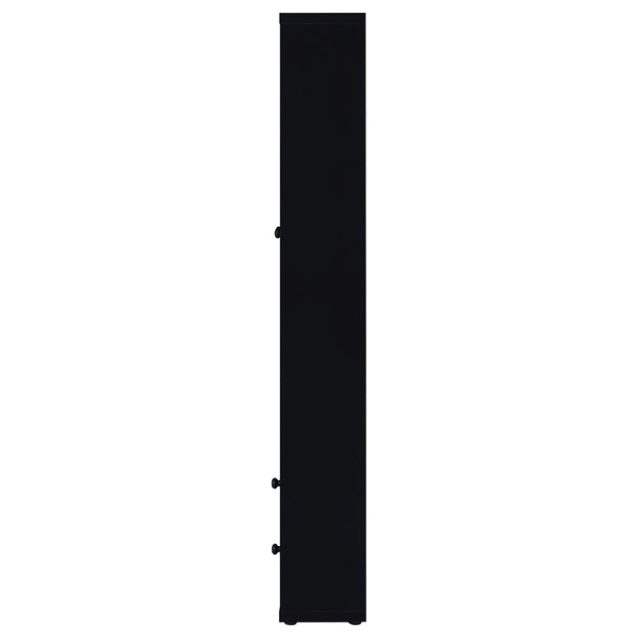 Glass doors are a key feature on a modern accent cabinet that blends into a variety of decors and living spaces. Providing four shelves for showing off everything from glassware to travel souvenirs, the cabinet features wood framed glass doors. They open to reveal two stationary and two adjustable shelves to accommodate all manner of items. In the base of the cabinet, two drawers add concealed storage, perfect for linens in the dining room, games in the den, and much more. The cabinet shows off a streamlined silhouette with petite round knobs that add the barest hint of texture and dimension to a neutral finish.